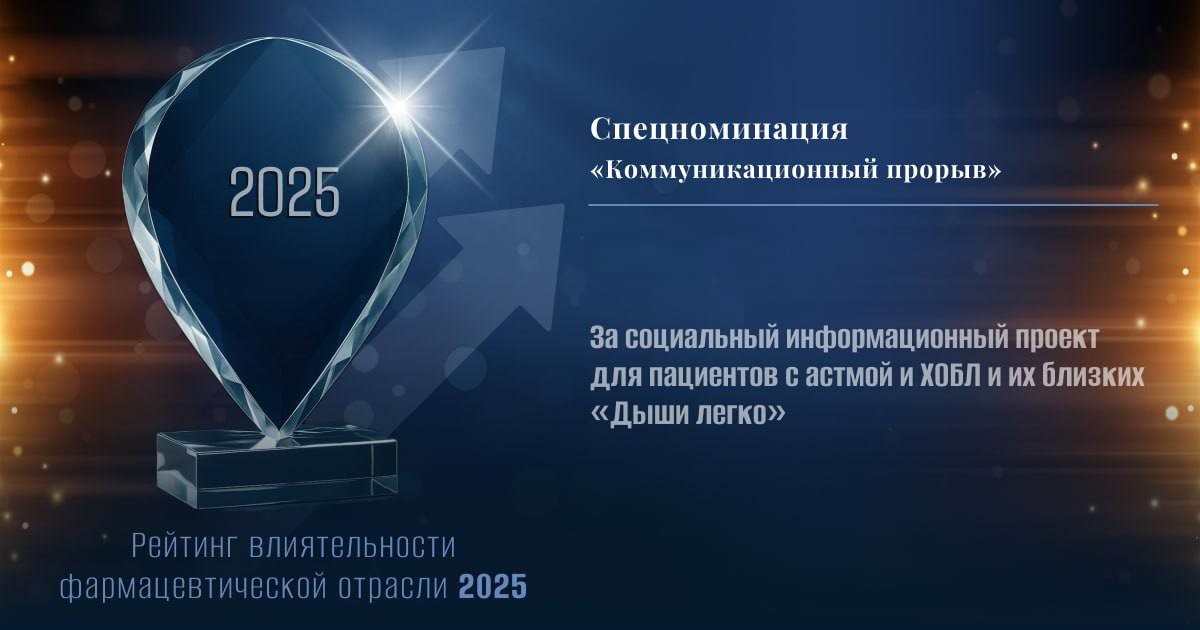 Социальный информационный проект для пациентов с астмой и ХОБЛ и их близких «Дыши легко» признан «Коммуникационным прорывом» 2025 года по версии отраслевого издания «Фармацевтический вестник». Церемония награждения состоялась в рамках конференции «ФармПроекции» в Сочи и объявления лидеров ежегодного «Рейтинга влиятельности на фармацевтическом рынке». В этом году читателям и редакции было впервые предложено определить компанию или эксперта, которые продемонстрировали открытое и заметное освещение актуальных проблем отрасли, способствуя формированию профессионального диалога и повышению прозрачности фармацевтического рынка в новой номинации «Коммуникационный прорыв года».